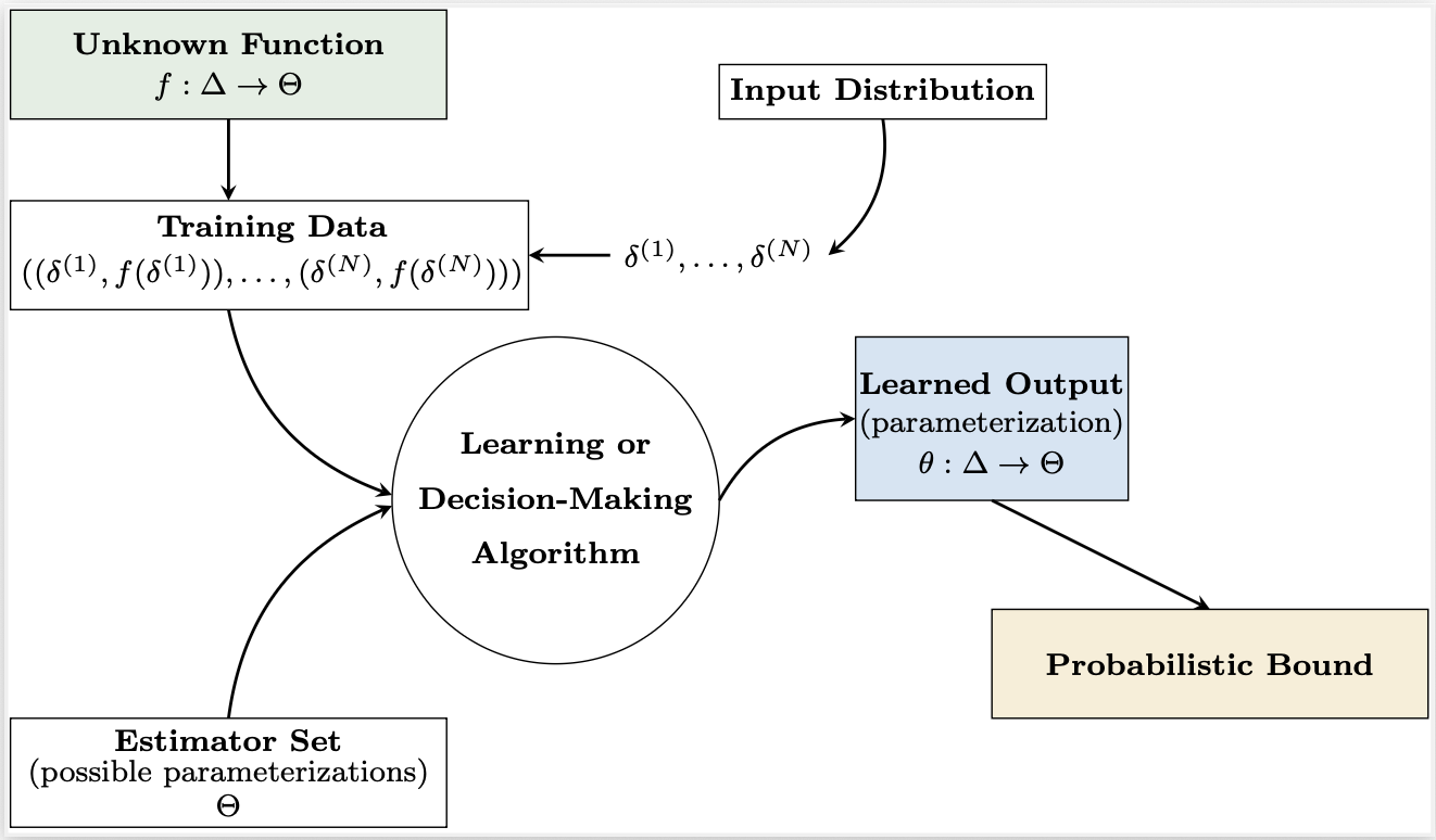 My research aims to quantify and understand the behavior and uncertainty of complex systems to enable safe, automated decision making. Specifically, I am interested in statistical verification of autonomous systems, including the derivation of probabilistic bounds for the correctness of learning or decision-making algorithms (see figure below). As automated decision making is integrated into safety-critical systems, engineers and regulators must provide quantitative guarantees, not just empirical evidence, to certify these technologies for safe and efficient real-world deployment. Probabilistic guarantees provide the rigorous evidence needed to ensure safe system behavior and meet certification standards, even under rare or unexpected conditions --- a prominent method for achieving this is reachability analysis.